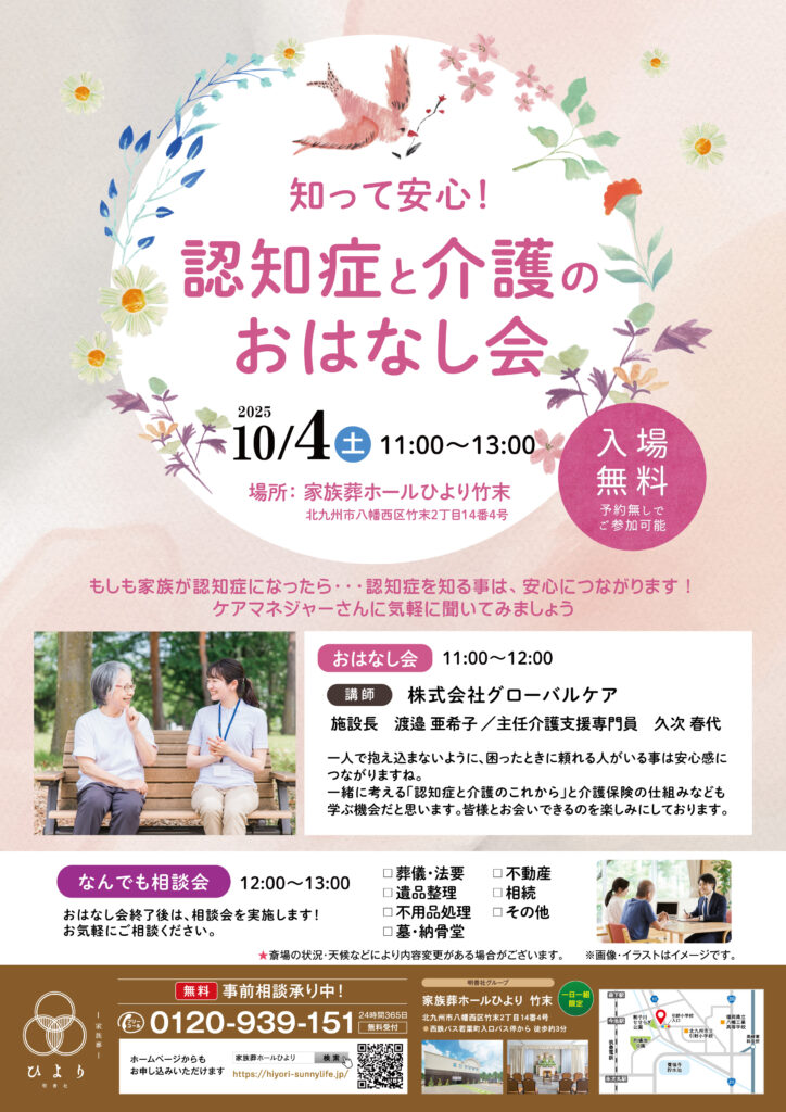 家族葬ホールひより 竹末にて「知って安心!認知症と介護のおはなし会」を開催いたします!