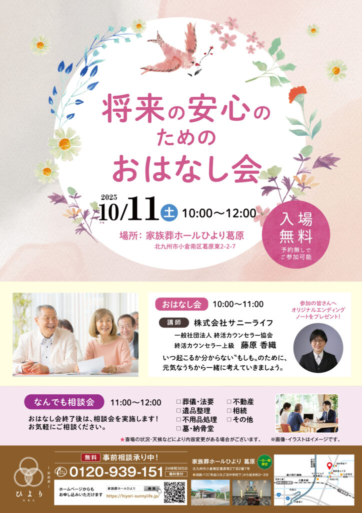 家族葬ホールひより 葛原にて「将来の安心のためのおはなし会」を開催いたします。